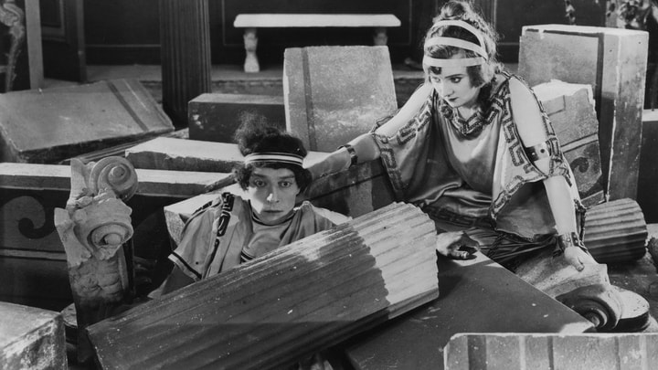 "The Three Ages," Buster Keaton's first feature-length film after a number of comedy shorts, is his parody of Griffith's "Intolerance." Keaton tells three parallel stories about the perils of romance, one set in the Stone Age, one during the Roman Empire, and one during the 20th century.