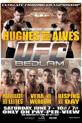 UFC 85: Bedlam was a mixed martial arts event held by the Ultimate Fighting Championship (UFC), on June 7, 2008 at The O2 arena in London, England. Former two-time UFC® welterweight champion MATT HUGHES begins his run for an unprecedented third title against a young gun eager to take his place near the top of the 170-pound ladder in Brazilian slugger THIAGO “PITBULL” ALVES.