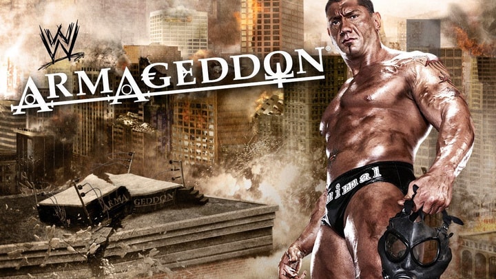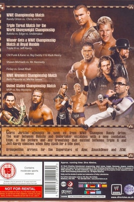 Chris Jericho attempts to save us from WWE Champion Randy Orton. The war between Batista and Undertaker escalates with a new combatant, Edge, in the picture and any friendship that existed between Triple H and Jeff Hardy vanishes when they clash for a title shot. Armageddon arrives for the Superstars of Raw, Smackdown and ECW.
