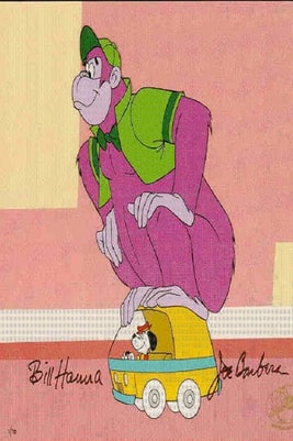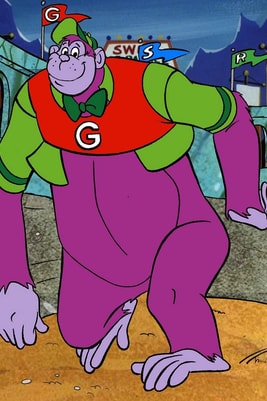 Grape Ape stands a whopping 40 feet tall and loves the colour green (note hat, jacket and bow tie). He loves to follow up most statements by repeating his name twice ("Grape Ape. Grape Ape"). Along with his canine pal Beegle Beagle (or "Beegley Beagley" as our purple ape would say) the two roam through the country landing themselves in all sorts of zany situations. Luckily being a 40 foot purple ape means there aren't too many problems you just can't sit on. Grape Ape's comic book life was pretty short - only 2 regular issues of his own title. He first appeared on ABC's The Tom and Jerry/Grape Ape show between 1975-1976. He then appeared in his very own half hour show in 1977 and was a regular on Scooby Doo's All Star Laff-a-lympics as a member of the Yogi-Yahooeys between 1978-1980.